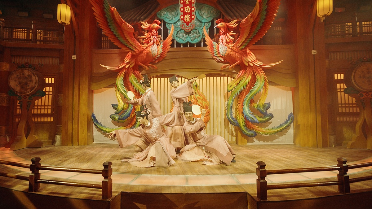 宋人(ren)周咊(he)的(de)故事在(zai)這一(yi)空間中(zhong)畫下句點,爲(wei)了(le)紀念周細等(deng)抗金壯士,周莊父老栽下銀杏,後(hou)成(cheng)爲(wei)一(yi)代(dai)代(dai)水鄉(xiāng)百(bai)姓祈福的(de)神樹。而現(xian)代(dai)周咊(he)的(de)夢還在(zai)繼續着,揮别宋人(ren)周咊(he)後(hou),他(tā)接過(guo)尋路魚燈,在(zai)銀杏樹下爲(wei)迷途者掌燈,也(ye)見證着來來往往的(de)周莊故人(ren)。時空交錯,張翰、周迪功郎、沈萬三、章騰龍、阿金、葉楚伧、陳逸飛、三毛等(deng)一(yi)衆周莊故人(ren)入夢,訴說着他(tā)們“隻此周莊”的(de)情懷。忽然,全福寺鍾聲傳(chuan)來,天蒙蒙亮起,青年(nian)在(zai)窗外姑娘賣花(huā)聲中(zhong)醒來,似曾相識的(de)船娘笑聲朗朗傳(chuan)來。他(tā)伸了(le)箇(ge)懶腰,這時夢醒了(le)……